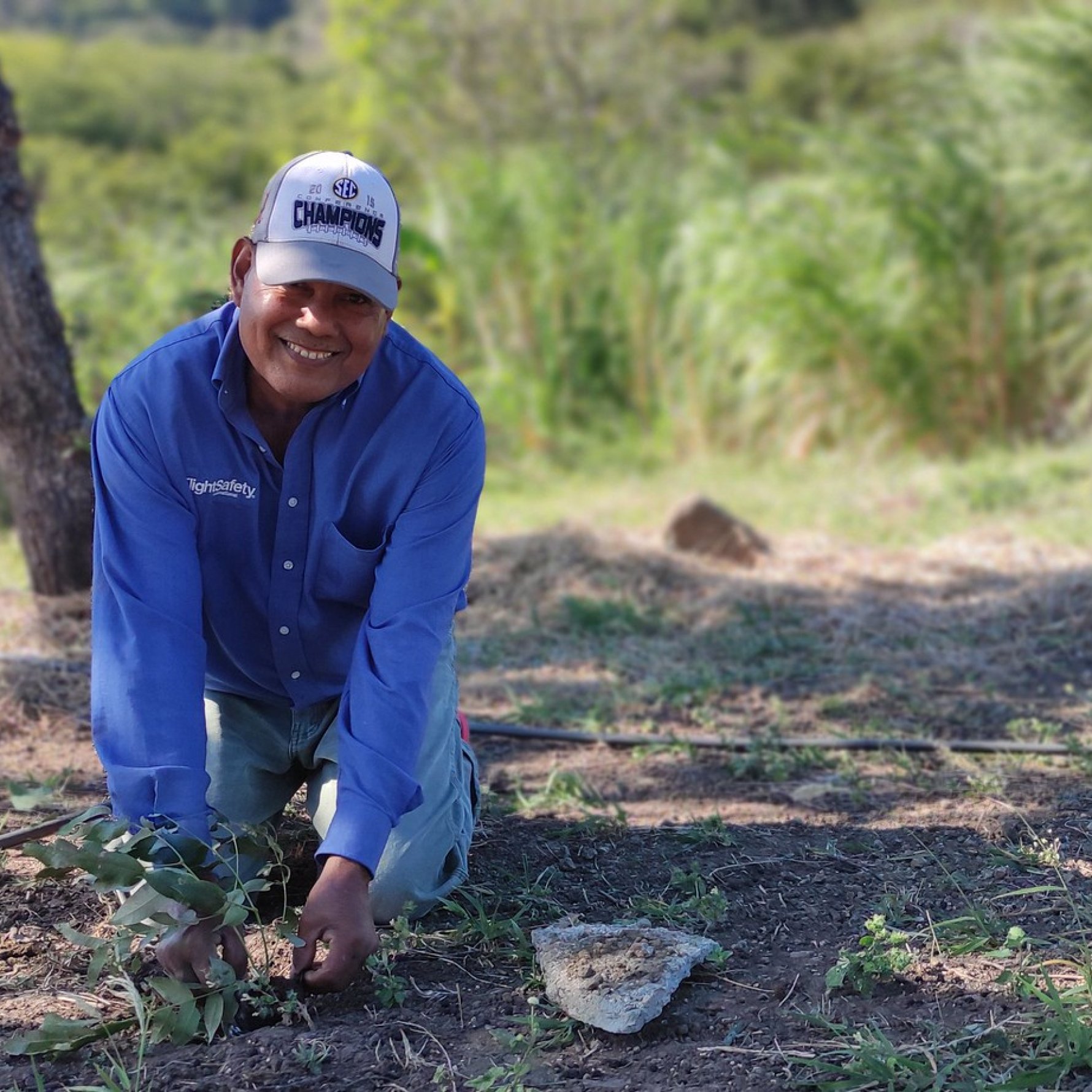 Juan-José Pérez Benavides planterar ett träd på sin mark.