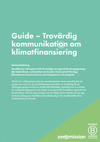 Vi har utvecklat den här kommunikationsguiden som visar hur du och ditt företag kan berätta om ert bidrag till omställningen genom köp av certifierade kolkrediter, samtidigt som ni undviker de vanligaste fallgroparna och stärker er position inför framtidens regelverk och förväntningar. Den tar upp principer som är viktiga att ha i åtanke och ger dig konkreta verktyg och checklistor att använda dig av för att säkerställa korrekt kommunikation.